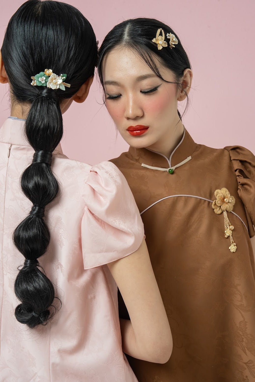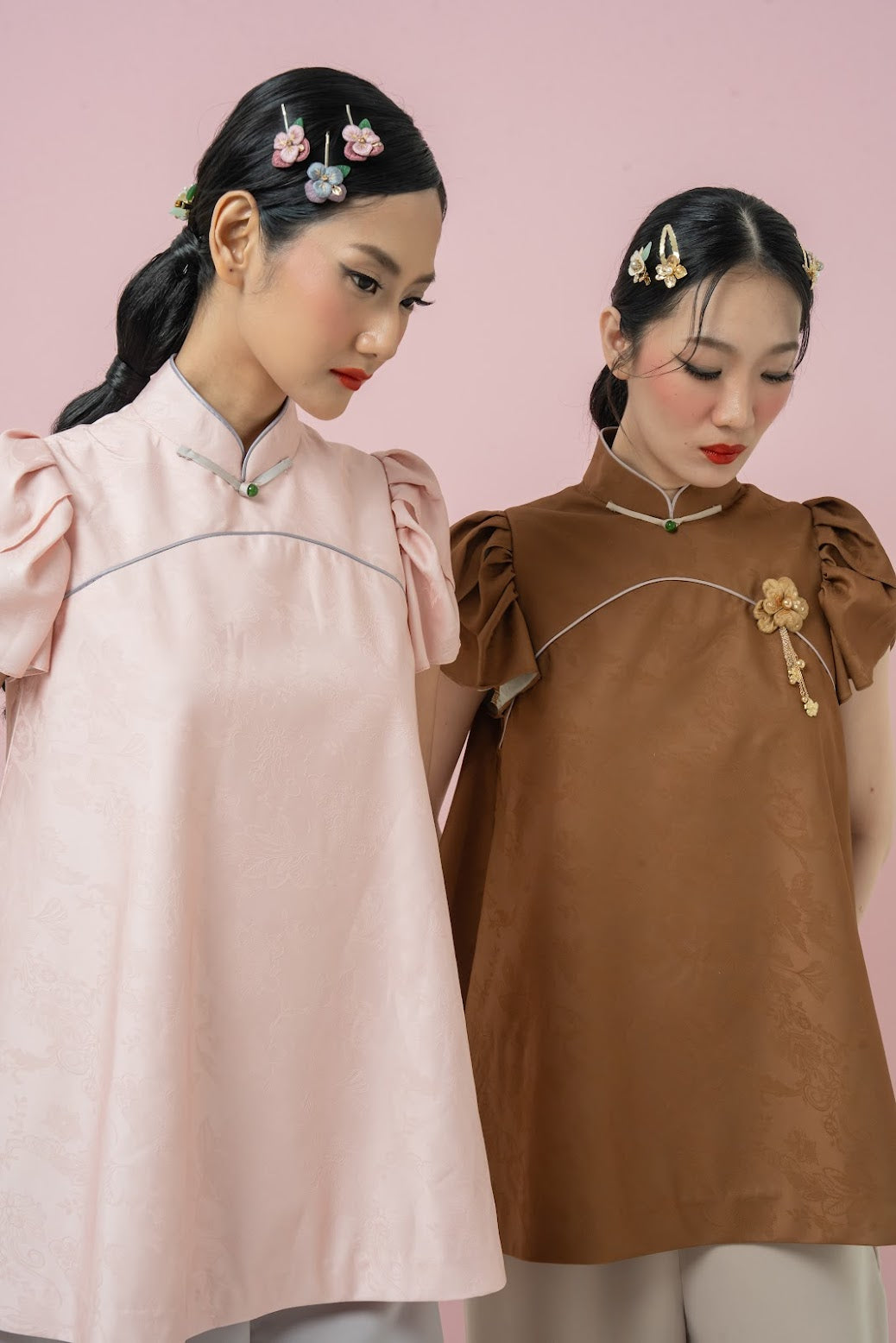 A baby-doll style tunic top with a modern qipao collar, crafted from ultra-soft fabric featuring a subtle woven pattern. Its gentle flare and classic detailing create a look that’s both timeless and effortlessly charming.